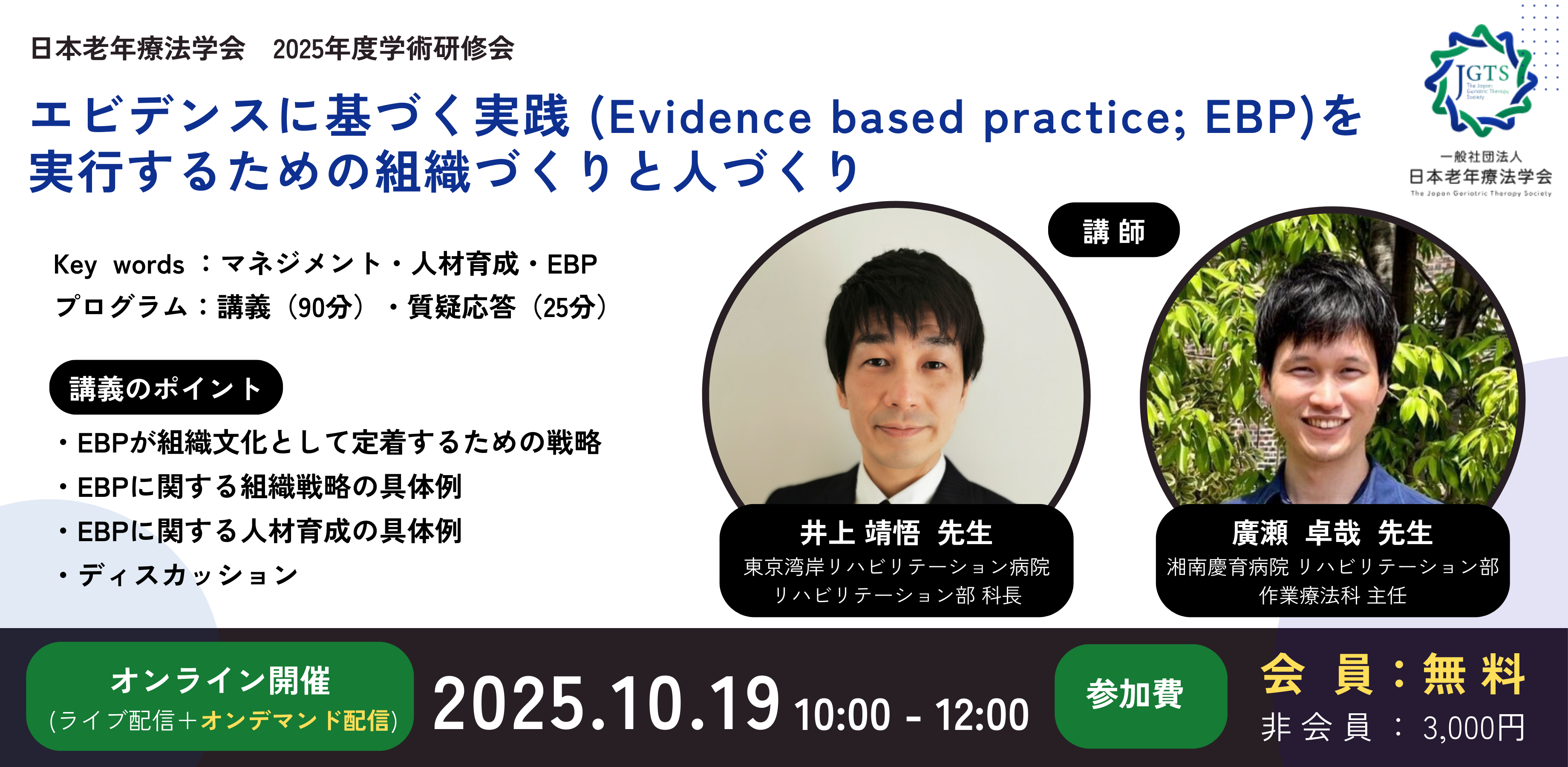 “エビデンスに基づく実践 (Evidence based practice; EBP)を実行するための組織づくりと人づくり“をテーマとしています。 EBPを組織文化として根付かせるための組織戦略と人材育成をテーマに、新人教育体制、必要な能力や態度、臨床教育、各施設での実践例について、組織として学術実績豊富な先生方にご解説いただきます。 医療従事者にとってEBPの重要性は広く認識されていますが、組織単位でEBPを実践するための組織文化づくりを学ぶ機会は多くありません。本研修会では、実際の取り組み例を通じて、その具体的な方法やポイントを学ぶことができます。 申し込みはこちらのURLからお願いいたします。 https://jgts2025education2.peatix.com/view 本研修会では、事前質問を受け付けております。 是非とも多くのご質問をよろしくお願いいたします。 研修会の詳細情報は下記をご参照ください。 【開催日時】2025年10月19日(日) 10時00分〜12時00分 【講師情報】 ・井上 靖悟 先生(東京湾岸リハビリテーション病院 リハビリテーション部 科長) ・廣瀬 卓哉 先生(湘南慶育病院 リハビリテーション部 作業療法科 主任) 【申し込み期限】2025年10月14日(火) 【参加費】(会員)無料, (非会員)3,000円 【その他】2週間のオンデマンド動画配信、配布資料有り |