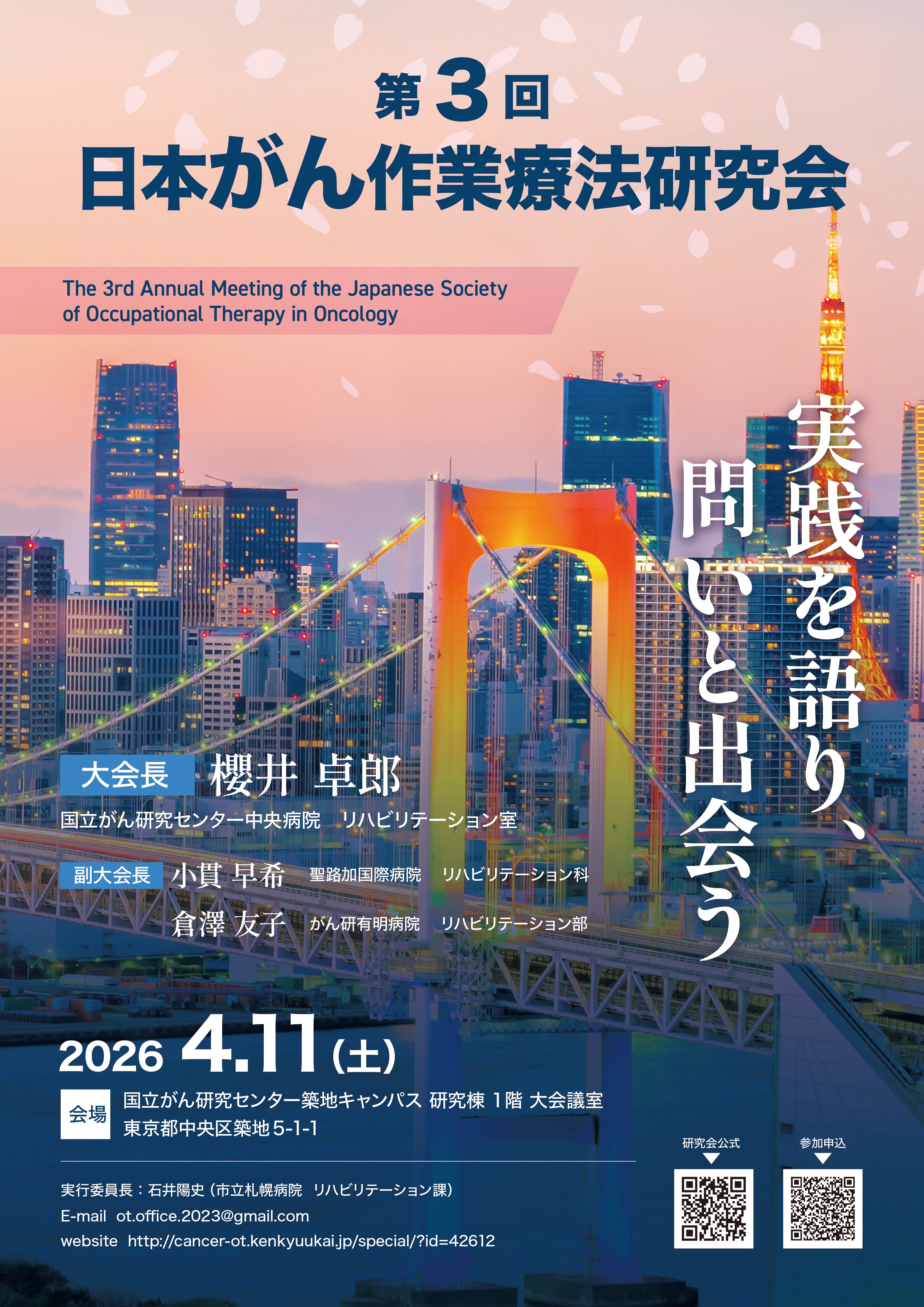 2026年4月11日(土)9:00~19:00 第3回日本がん作業療法研究会 「実践を語り、問いと出会う」 大会長:櫻井 卓郎/実行委員長:石井 陽史/副大会長:小貫 早希、倉澤 友子 参加申し込み、プログラムは準備中です。 今後公式ホームページにて掲載予定です。 |