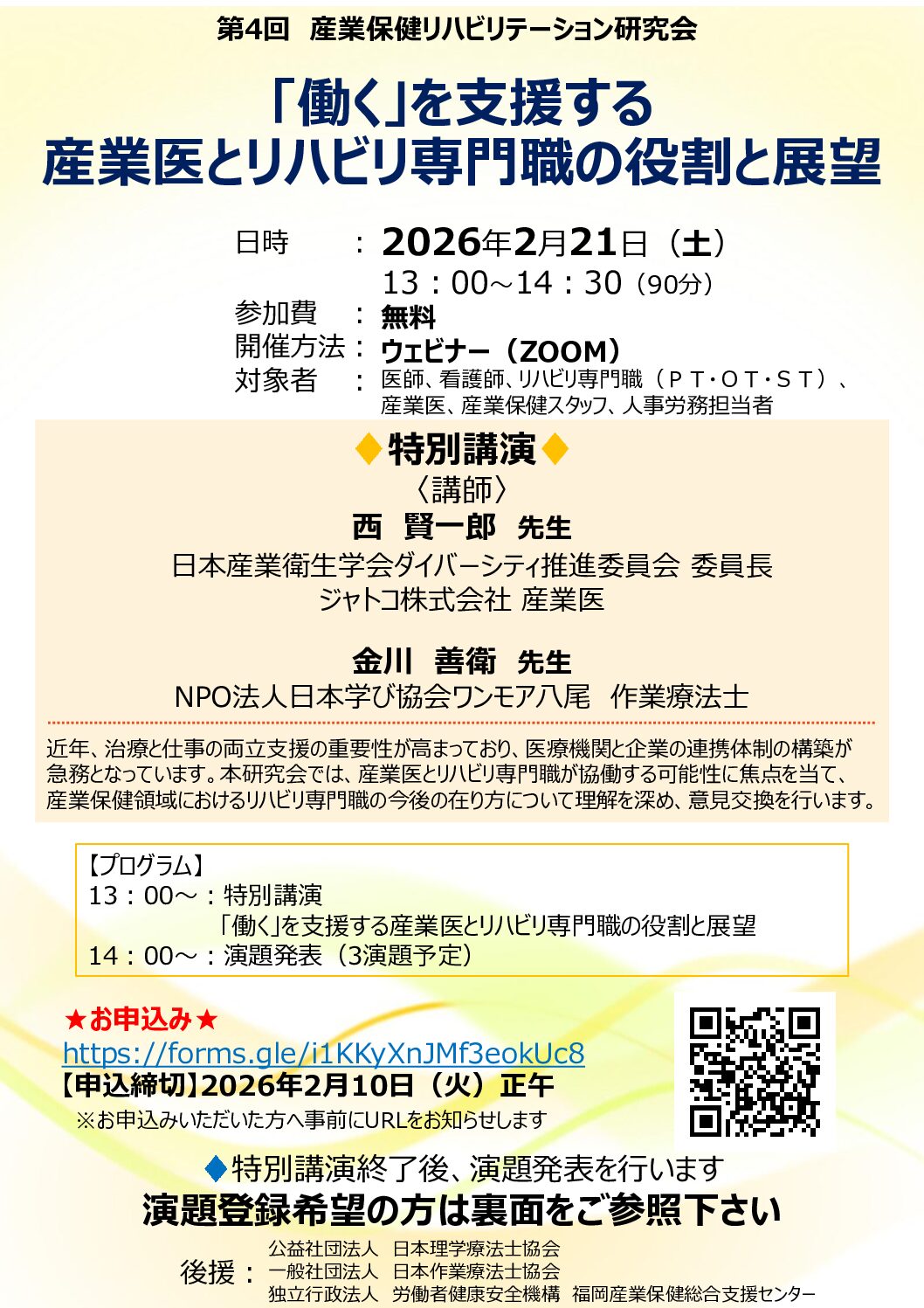 | 参加資格 | 医師、看護師、リハビリ専門職(PT,OT,ST)、産業医、産業保健スタッフ、人事労務担当者 |