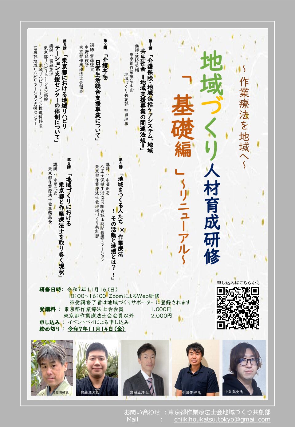 アーカイブ配信しておりました地域づくり人材育成研修「基礎編」を、講義内容をアップデートしリニューアル開催いたします。 受講済みの方も学び直しにご受講いただけますと幸いです。 ※受講済みの方はhttps://forms.gle/JoNRpKedrmBjgcicAよりお申し込みください 募集要項 1.地域づくり人材育成研修実施の目的 「都内全地域で地域における作業療法実践を推進する~作業療法士が自信と誇りをもって地域での作業療法を展開できる~」この目標のもと、本研修で育成された人材による地域への作業療法支援体制を構築し、東京都民の健康的な生活を実現すべく、各地域で実施されている介護予防や地域支援事業に寄与できることを目指す。 2.研修のねらい 地域づくり人材育成基礎編 高齢者分野における社会保障制度について理解 高齢者分野の社会的背景を理解 地域の特色について理解を深める 地域リハビリテーションについて理解 地域で働く他の職種への理解を深める 3.対象者 1)東京都作業療法士会会員 2)日本作業療法士協会会員 3)作業療法士国家資格をお持ちの非会員 これらいずれかに該当する方 4.受講免除規定 地域づくり人材育成研修基礎編は、以下の者の受講を免除することが出来ます。 ・東京都・三士会主催の地域リハビリテーション専門人材育成研修修了者 ・東京都作業療法士会地域包括ケア対策委員会が主催する所定の研修修了者 ・東京都が実施する介護予防事業・総合事業・地域ケア会議関連研修受講者 免除希望者は下記URLから受講免除申請を行ってください。 受講が免除された方は「基礎編」を受講しなくても「地域づくりサポーター」として登録されます。 https://docs.google.com/forms/d/e/1FAIpQLSfmT09dG7iKIuuBDh_ozUsT62lk4zHbHZ_Fy5jsLacIThYMoA/viewform 5.研修日程・会場(開催方式) 研修日程 : 令和7年11月 16日(日) 研修時間 : 10:00 ~ 16:30 会場(開催方式) : ZoomによるWeb開催 6.申し込み方法及び申し込み、締め切り イベントペイによる申し込み(キャンセルは東京都作業療法士会キャンセル規定に準ずる) 申し込み締め切り: 令和7年11月14日(金) 7.受講終了証・認定証の発行 本研修は①基礎編、②実践基礎編、③実践編の3部構成とし、それぞれ受講終了証を発行。全過程受講修了者には地域づくり推進リーダー認定証(仮称)を発行する。 8.受講料 東京都作業療法士会会員 :¥1.000円 その他作業療法士国家資格を有するもの:¥2.000円 ※キャンセルは東京都作業療法士会キャンセル規定に準ずる ※受講費のお支払いはお申し込みから3日以内に行ってください。お支払いが行われない場合にはキャンセルとなります 9.研修プログラム 【講義内容・講師】 第1講 「介護保険・地域包括ケアシステム、地域共生社会 =地域支援事業の関連法規=」 講師:猪股英輔 氏 東京都作業療法士会地域づくり共創部担当理事 第2講 「介護予防・日常生活支援総合事業について」 講師:齋藤洸太 氏 中野区役所 / 東京都作業療法士会理事 第3講 「東京都における地域リハビリテーション支援センターの体制について」 講師:齋藤正洋 氏 東京都リハビリテーション病院 第4講 「地域をつくる人たち×作業療法~その活動と連携とは?~」 講師:中澤 正宏 氏 八王子保健生活協同組合城山訪問看護ステーション /地域づくり共創部 第5講 「地域づくりにおける東京都と作業療法士を取り巻く現状」 講師:中里武史 氏 東京都作業療法士会事務局長 |