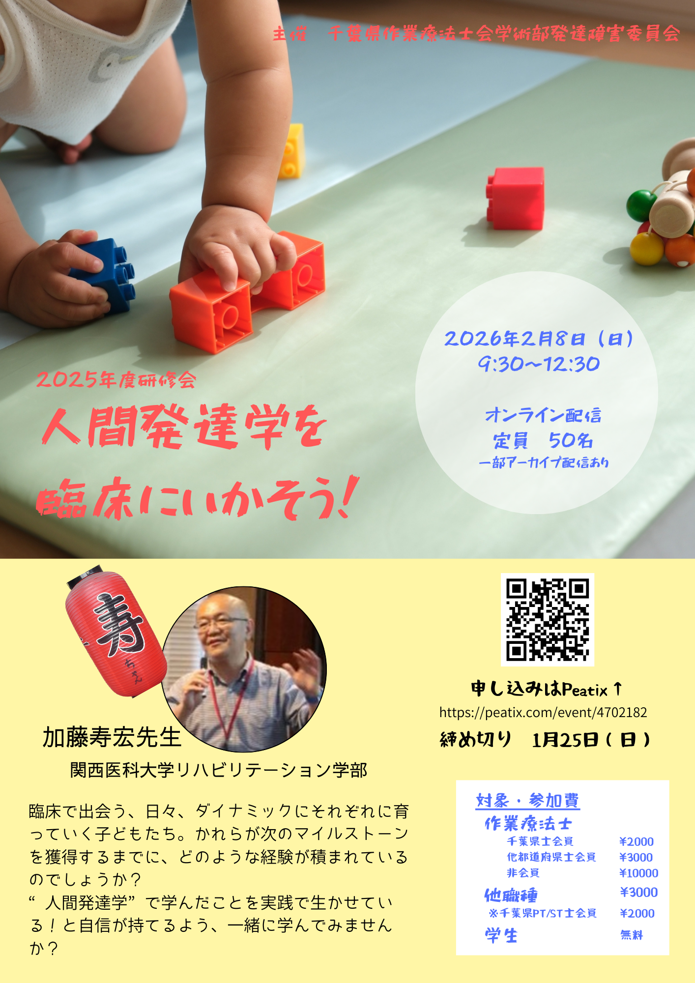 1.研修会名:令和7年度千葉県作業療法士会学術部発達障害委員会研修会『人間発達学を臨床に活かそう!』 2.研修期日:2026年2月8日(日曜日)9:30~12:30 (受付9:00~)※質疑などの一部を除きアーカイブ配信も予定しています。 3.場所:オンライン(Zoom) 4.研修会内容:本研修では、養成教育でも必須とされる『人間発達学』の中から、特に”運動発達”に焦点を当て、加藤寿宏先生にご講義をいただきます。発達領域の現場で、運動発達の知識を評価や支援・治療にどのように生かすのか、そのための視点や考え方を、実践に結びつけながらマイルストーンの繋がりを意識して学びます。 5.講師:加藤寿宏先生(関西医科大学リハビリテーション学部) 6.定員50名(アーカイブは定員なし) 5.講師:加藤寿宏氏(関西 |
