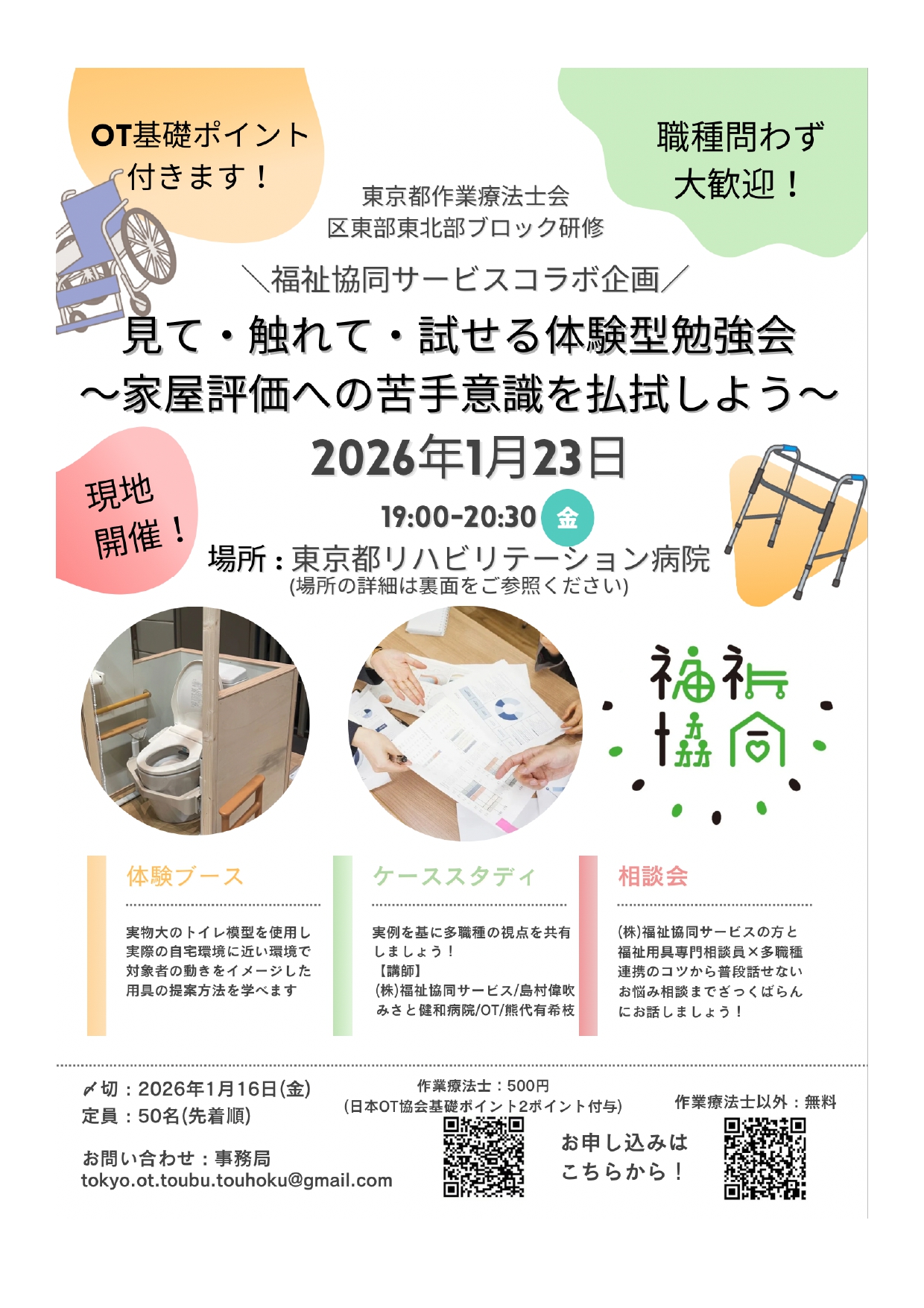 テーマ:区東部・東北部ブロック研修 見て・触れて・試せる体験型勉強会〜家屋評価への苦手意識を払拭しよう〜 日時:2026年1月23日(金曜日)19:00~20:30(18:30受付開始) 会場:〒131-0034 東京都墨田区堤通2-14-1 (東武スカイツリーライン鐘ヶ淵駅 徒歩7分) 講師:島村 偉吹 氏((株)福祉共同サービス 福祉用具専門相談員) 熊代 有希枝 氏(医療法人財団 健和会 みさと健和病院 作業療法士) 概要(PR):『対象者に合った福祉用具をどうやって提供したらいい?』 『家屋評価で多職種と何を話せばいいんだろう?』『なんとなく家屋評価に苦手意識がある…』 そんなお悩みを解決しませんか? 今回の研修では、(株)福祉共同サービスの皆様にご協力いただき、体験・ケーススタディ・相談会を通して、家屋評価での福祉用具選定の考え方や、多職種との連携のコツを学んでいただきます。 体験ブースでは、実物大のトイレ模型を使用することで、対象者の動きをイメージしながら福祉用具の選定方法を学ぶ事ができます。 また、今回は職種問わず参加可能な研修会ですので、多職種の視点の共有からお悩み相談まで、普段中々話せない他職種との交流にも繋がります。ケーススタディ・相談会でたくさんお話しましょう。 たくさんの方のご応募をお待ちしております。 申込期限:2026年1月16日(金) |