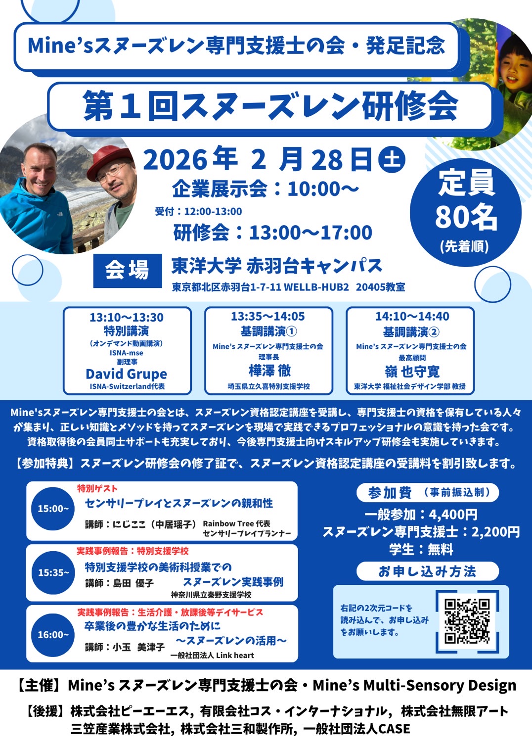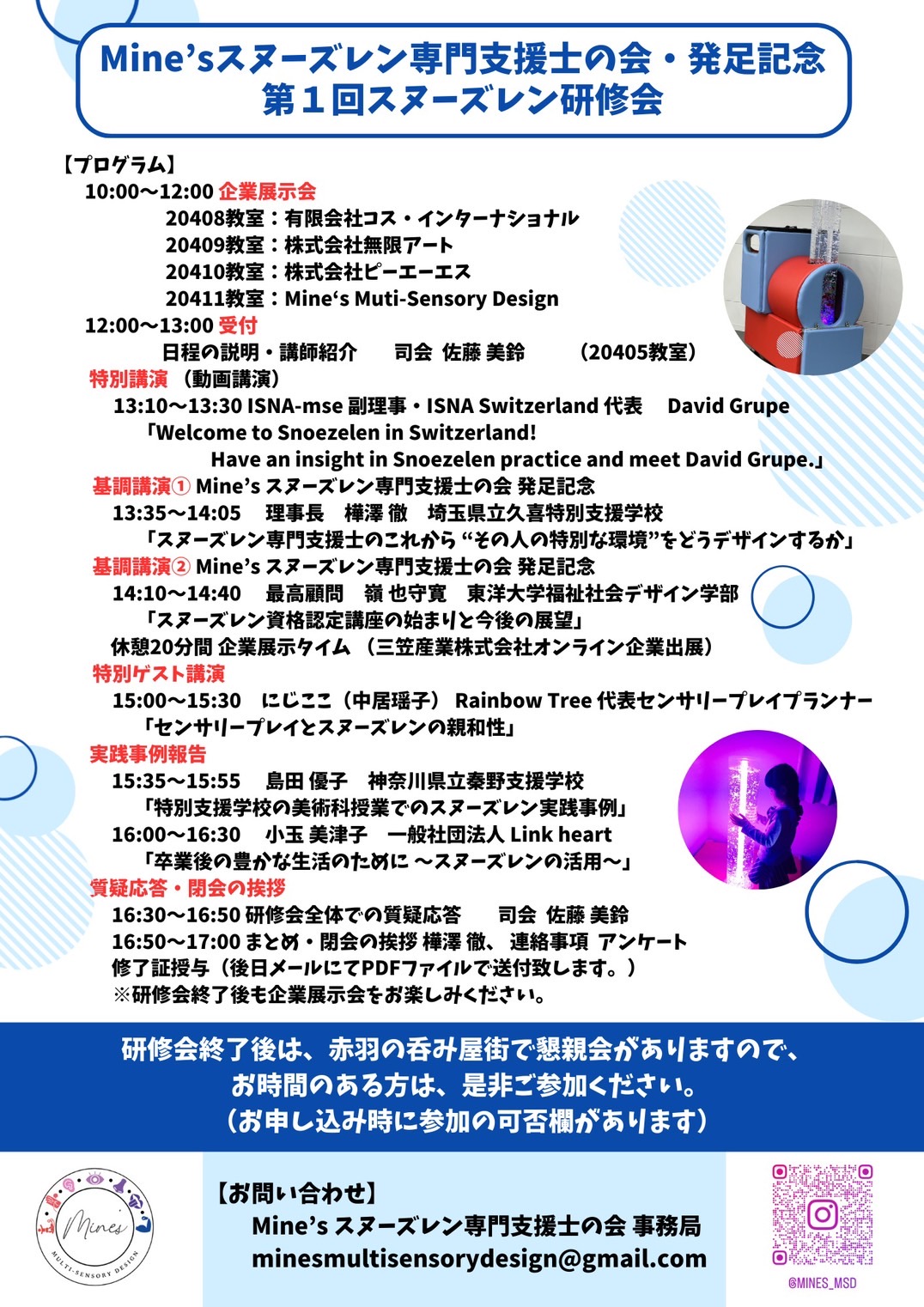 Mine’sスヌーズレン専門支援士の会・発足記念 第1回スヌーズレン研修会のお知らせ スヌーズレンに関わる方や興味のある方が、安心してつながり、楽しく学べる研修会です。 国内外の専門家による講演や、学校・施設での実践報告、センサリープレイのゲスト講演など、スヌーズレンをより身近に感じられるプログラムをご用意しました。 はじめての方も、日頃支援に携わっている方も大歓迎です。 【日時】 2026年2月28日(土) 企業展示 10:00〜 研修会 13:00〜17:00(受付 12:00〜) 【会場】 東洋大学 赤羽台キャンパス(東京都北区) 【内容】 ・ISNA-Switzerland 副理事 David Grupe 氏の特別講演(動画) ・発足記念の基調講演 ・スヌーズレンの実践例の紹介 ・センサリープレイ × スヌーズレンの特別ゲスト講演 ・企業展示ブース 【参加特典】 修了証をPDFでお届けします。 今後のスヌーズレン資格講座の受講料割引もあります。 【定員】 80名(先着) 【参加費】 一般 4,400円 専門支援士会員 2,200円 学生 無料 研修会後には、希望者で赤羽駅周辺で 気軽にお話できる“ゆるい懇親会”も予定しています。 主催: Mine’sスヌーズレン専門支援士の会・Mine’s Multi-Sensory Design |