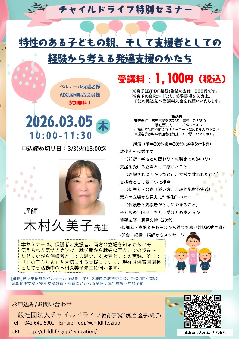 2025年度最後のオンラインセミナー としてチャイルドライフ特別セミナー「特性のある子どもの親、そして支援者としての経験から考える発達支援の形」を企画しました!