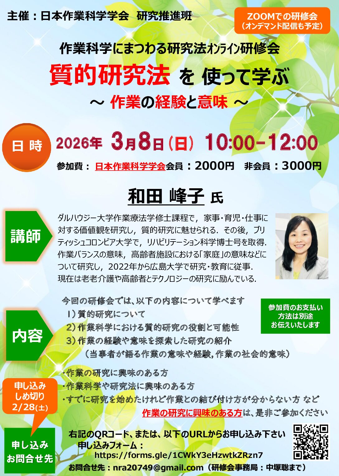 ◆開催概要(別途、案内チラシも添付いたします) ・テーマ:作業科学にまつわる研究法オンライン研修会 「質的研究法を使って学ぶ ~ 作業の経験と意味 ~」 ・日 時:2026年3月8日(日)10:00-12:00(受付9:45‐) ・場 所:ZOOMによるオンライン研修会 ・講 師:和田峰子氏 ・参加費:会員2000円、非会員3000円 (日本作業科学学会の会員です。日本作業療法士協会の会員ではありません) ・その他:本研修会はオンデマンド配信を予定しています。 ◆内容: 1)質的研究について 2)作業科学における質的研究の役割と可能性 3)作業の経験や意味を探索した研究の紹介(当事者が語る作業の意味や経験,作業の社会的意味) 作業科学や研究法に興味のある方、すでに研究を始めたけれど作業との結び付け方が分からない方 など作業の研究に興味のある方に向けた内容となっております。ぜひご参加ください |