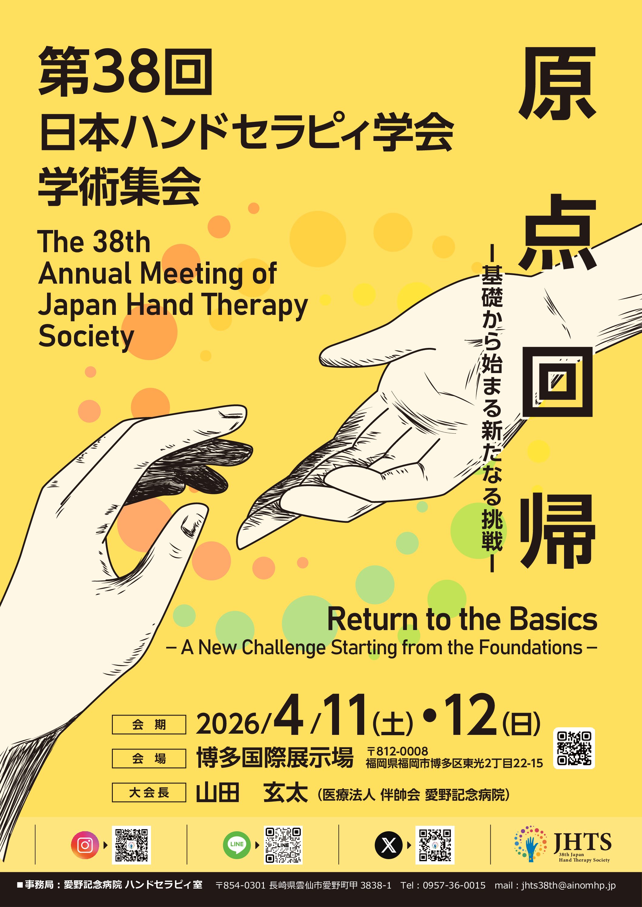 【学術集会名】第38回日本ハンドセラピィ学会 学術集会 【会長】山田玄太(愛野記念病院 手外科センター) 【テーマ】原点回帰-基礎から始まる新たなる挑戦- Return to the Basics -A New Challenge Starting from the Foundations- 【会期】2026年4月11日(土)12日(日) 【会場】博多国際展示場 & カンファレンスセンター (〒812-0008 福岡県福岡市博多区東光2丁目22-15) 【開催形式】現地開催 + オンデマンド配信 【会費】早期登録 会員12000円 非会員13000円 通常登録 会員15000円 非会員16000円 【参加申し込み期間】早期登録期間 2月1日 ~3月28日 通常登録期間 3月29日~4月26日 【予定プログラム】 特別講演:「TFCC損傷の基礎と臨床」 中村 俊康 先生(国際医療福祉大学医学部整形外科学) 教育講演:「手・上肢の構造・機能と進化」 玉井 誠 先生(医療法人 手のクリニック 西18丁目・手のクリニック) 「メノポハンドを知る」 平瀬 雄一 先生(東京ミッドタウンクリニック手外科) 海外招待講演,国際シンポジウム,シンポジウム,各種セミナー,一般演題など 【ホームページ】https://38jhts.com/ |