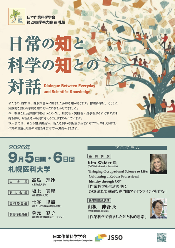 【第29回日本作業科学学会 学術大会(2026年)開催のお知らせ】 下記のとおり、日本作業科学学会第29回学術大会を開催いたします。 本大会では、「日常の知と科学の知との対話」をテーマに、基調講演、研究発表、シンポジウムなどを通じて、日々の生活や実践から生まれる知と科学的知の交わりから、新たな視点や問いを育むことを目指します。 ご多忙の折とは存じますが、ぜひご参加くださいますようご案内申し上げます。 テーマ:「日常の知と科学の知との対話 Dialogue Between Everyday and Scientific Knowledge」 日 時:2026年9月5日(土)・6日(日) 会 場:札幌医科大学保健医療学部 (住所:札幌市中央区南1条西17丁目) 内 容:基調講演、研究発表、シンポジウム ほか 参加費:事前受付(正会員) 7,000円,事前受付(非会員)10,000円 事前・当日受付(学生:学部生のみ) 500円 当日受付(正会員) 9,000円,当日受付(非会員)12,000円 申込方法等:公式HPから参加フォームにて登録 公式HP:https://osgakkai‐sapporo2026.jimdosite.com/ ※本学会は⽇本作業療法⼠協会 ⽣涯教育基礎ポイントの対象になります(2ポイント) <お問い合わせ先> 学会事務局 E-mail:jssoc2026sapporo@gmail.com |
