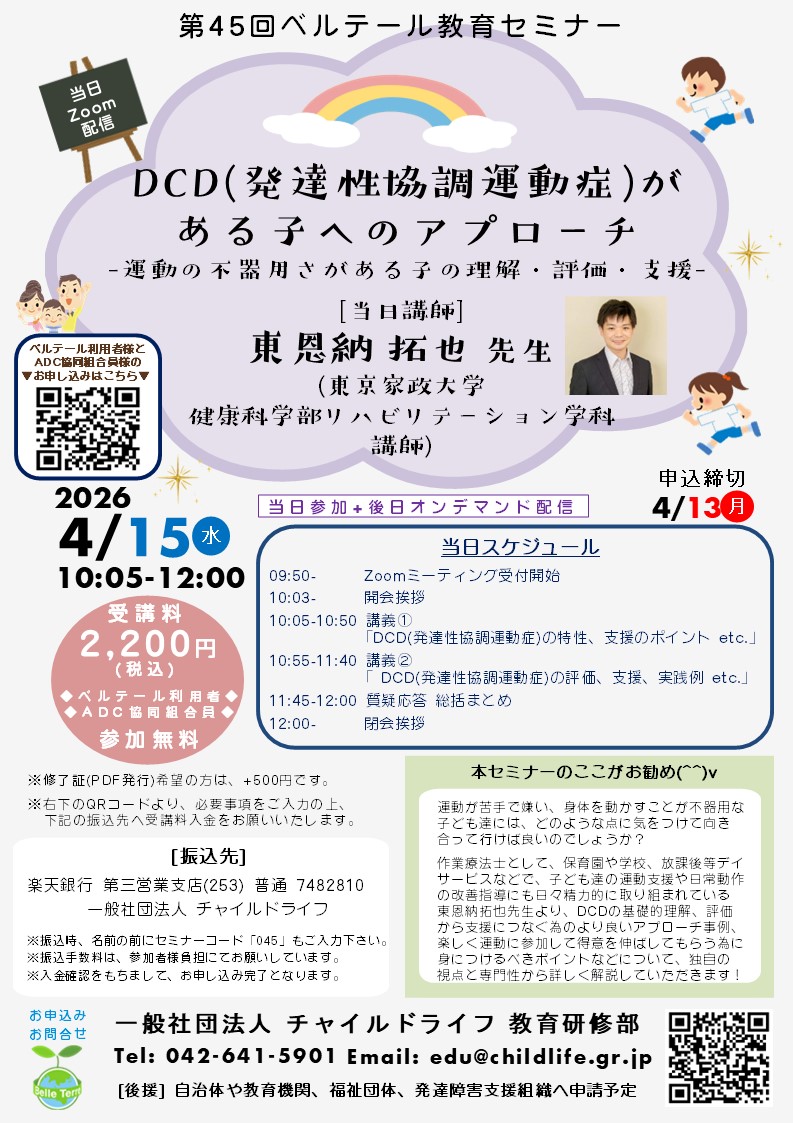 【セミナー名】 第45回ベルテール教育セミナー「DCD(発達性協調運動症)がある子へのアプローチ」-運動の不器用さがある子の理解・評価・支援- 【開催日時】 2026年4月15日(水) 10:05~12:00 【主催者】 一般社団法人 チャイルドライフ 【当日講師】 東恩納拓也先生 (東京家政大学健康科学部リハビリテーション学科 講師) 【セミナー概要】 運動が苦手で嫌い、身体を動かすことが不器用な子ども達には、どのような点に気をつけて向き合って行けば良いのでしょうか? 作業療法士として、保育園や学校、放課後等デイサービスなどで、子ども達の運動支援や日常動作の改善指導にも日々精力的に取り組まれている東恩納拓也先生(東京家政大学健康科学部リハビリテーション学科)より、DCDの基礎的理解、評価から支援につなぐ為のより良いアプローチ事例、楽しく運動に参加して得意を伸ばしてもらう為に身につけるべきポイントなどについて、独自の視点と専門性から詳しく解説していただきます。 運動嫌いのお子様へのより良い向き合い方や効果的な指導方法について、日々悩まれている児童指導員、保育士、児童相談員、教職員、カウンセラー、臨床心理士、医師、看護師、作業療法士、研究者、保護者様など児童発達支援に携わる関係者皆様の今後の活動やケアに活用していただけますと誠に幸いです。ぜひ皆様のご参加を心よりお待ちしています! 【当日プログラム】 ※10:00までに、最終案内メール記載の視聴用リンク先よりZoomミーティング待合室へお入りください。 10:03- 開会挨拶 10:05-10:50 講義1 [DCD(発達性協調運動症)の特性、支援のポイント etc.] 10:55-11:40 講義2 [DCD(発達性協調運動症)の評価、支援、実践例 etc.] 11:45-12:00 質疑応答 総括まとめ 12:00- 閉会挨拶 ※上記スケジュールおよび内容は諸事情により急遽変更になる場合がございますので、予めご了承ください。 【申込期限】 4月13日(月) 18:00 |