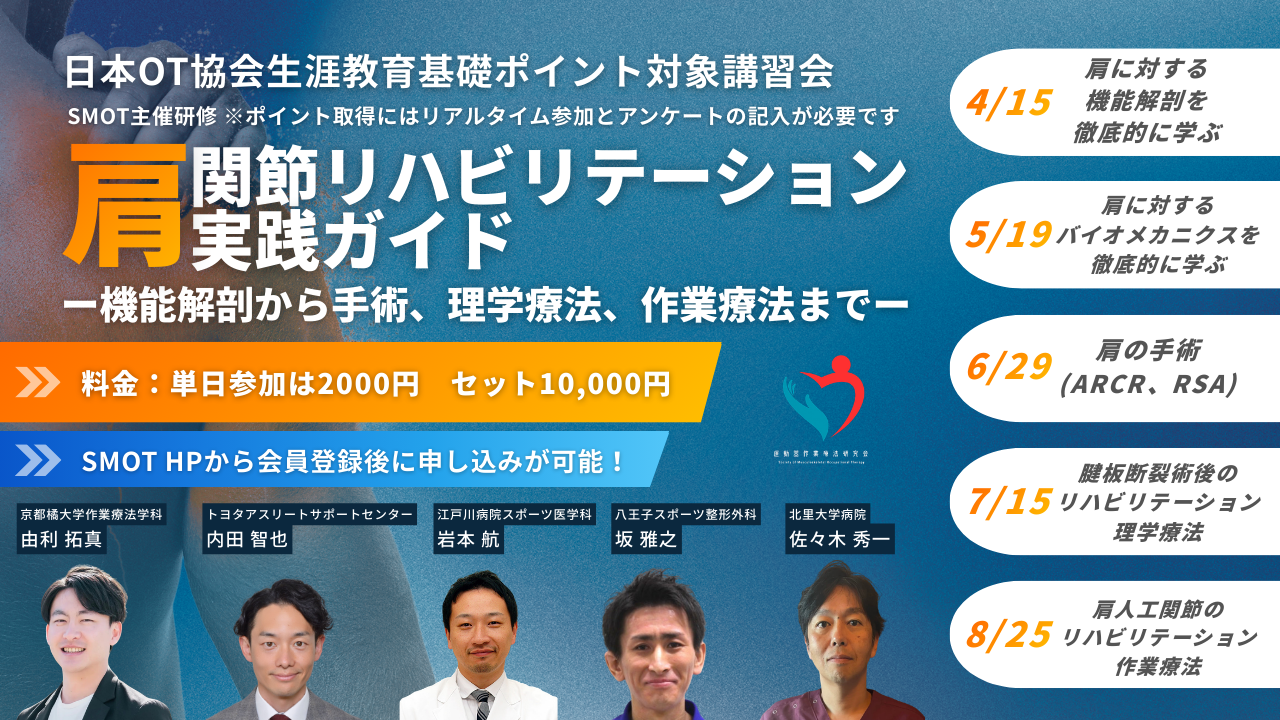 この度、SMOT主催研修として、「肩関節リハビリテーション実践ガイド ―機能解剖から手術、理学療法、作業療法まで―」 を全5回シリーズで開催いたします。 ■ 開催日程/テーマ 第1回は 4月15日(水)20時30分〜 京都橘大学作業療法学科の由利 拓真先生をお迎えし、 「肩に対する機能解剖を徹底的に学ぶ」をテーマに開催いたします。 第2回は 5月19日(火)20時30分〜 トヨタアスリートサポートセンターの内田 智也先生をお迎えし、 「肩に対するバイオメカニクスを徹底的に学ぶ」をテーマに開催いたします。 第3回は 6月29日(月)20時00分〜 江戸川病院スポーツ医学科の岩本 航先生をお迎えし、 「肩の手術(ARCR・RSA)」をテーマに開催いたします。 第4回は 7月15日(水)21時00分〜 八王子スポーツ整形外科の坂 雅之先生をお迎えし、 「腱板断裂術後のリハビリテーション 理学療法」をテーマに開催いたします。 第5回は 8月25日(火)20時30分〜 北里大学病院の佐々木 秀一先生をお迎えし、 「肩人工関節のリハビリテーション 作業療法」をテーマに開催いたします。 ■ 参加費用 参加費は単日参加が2,000円、全5回セットでのお申し込みは10,000円となっております。 ■ 留意事項 本研修は日本OT協会生涯教育基礎ポイント対象講習会となっております。ポイント取得にはリアルタイム参加とアンケートへのご記入が必要となりますので、あらかじめご了承ください。 ■ お申し込み方法 SMOT公式HPよりお申し込みいただけます。ぜひお早めにご登録・お申し込みください。 🔗 SMOT公式HP:https://www.s-mot.com/ 肩関節疾患は臨床でも頻度の高い疾患であり、機能解剖から手術、そして術後リハビリテーションまでを体系的に学べる大変貴重な機会です。各回単独でのご参加はもちろん、全5回を通じてご参加いただくことで、より深い理解と臨床力の向上につながると思います。皆さまのご参加を心よりお待ちしております。 運動器作業療法研究会 |
