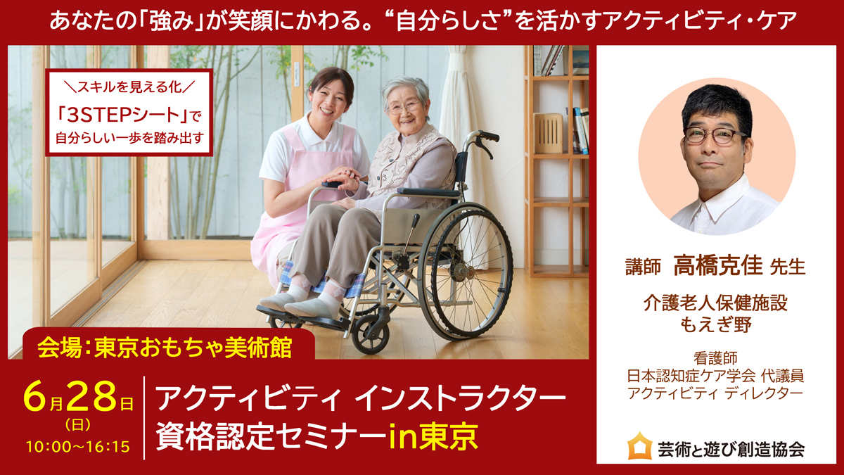 開催日:2026年6月28日(日)10:00~16:15 会 場:東京おもちゃ美術館 (〒160-0004 東京都新宿区四谷4-20) 「心の管理栄養士」として、要介護高齢者の意欲と笑顔を引き出す アクティビティ・ケアの基礎を5時間で学ぶ通学講座です。 リハビリや機能訓練を行っていても、 認知症の方の「意欲が続かない」、 「もっとその人らしい関わり方をしたい」 そんなことを感じることはありませんか。 本講座では、対象者の“心が動く瞬間”に着目し、 意欲や行動の変化につながる関わり方を学びます。 講義では、「レクリエーション」と「アクティビティ」の違いを整理し、 対象者の“心が動いた”ことで生活に変化が生まれた事例から、 アクティビティ・ケアの基礎理論を学びます。 実技では、ゲーム大会などのグループワークを通して、 体験的に理解を深め、明日からの臨床に活かせる視点を身につけていきます。 ◆こんな方におすすめの講座です ・リハビリや機能訓練に、“楽しさ”や“その人らしさ”を取り入れたい方 ・認知症の方との関わりに、よりよいヒントを見つけたい方 ・自分の強みや経験を臨床に活かしたい方 ◆本講座のポイント ① 心を動かす実践事例から学ぶアクティビティ・ケアの基礎理論 現場での実践をもとに、アクティビティ・ケアの考え方をわかりやすく学びます。 ② 身近な素材を使ったコミュニケーションツール制作&アクティビティ・トイ体験 高齢者のADL維持やコミュニケーションに役立つアクティビティ・トイを活用し、 実際に身体を動かしながら、“心が動く瞬間”を体感します。 ③ 「その人らしさ」を支えるには、「自分らしさ」の理解から 「3STEPシート」を使って、自分の得意なこと・経験・スキルを見える化し、 自分らしいかかわり方を考えます。 さらにグループワークでは、他の参加者のアイデアや視点を共有することで、 アクティビティのの幅を広げていきます。 講師:高橋克佳先生 介護老人保健施設もえぎ野 看護師 日本認知症ケア学会 代議員 |