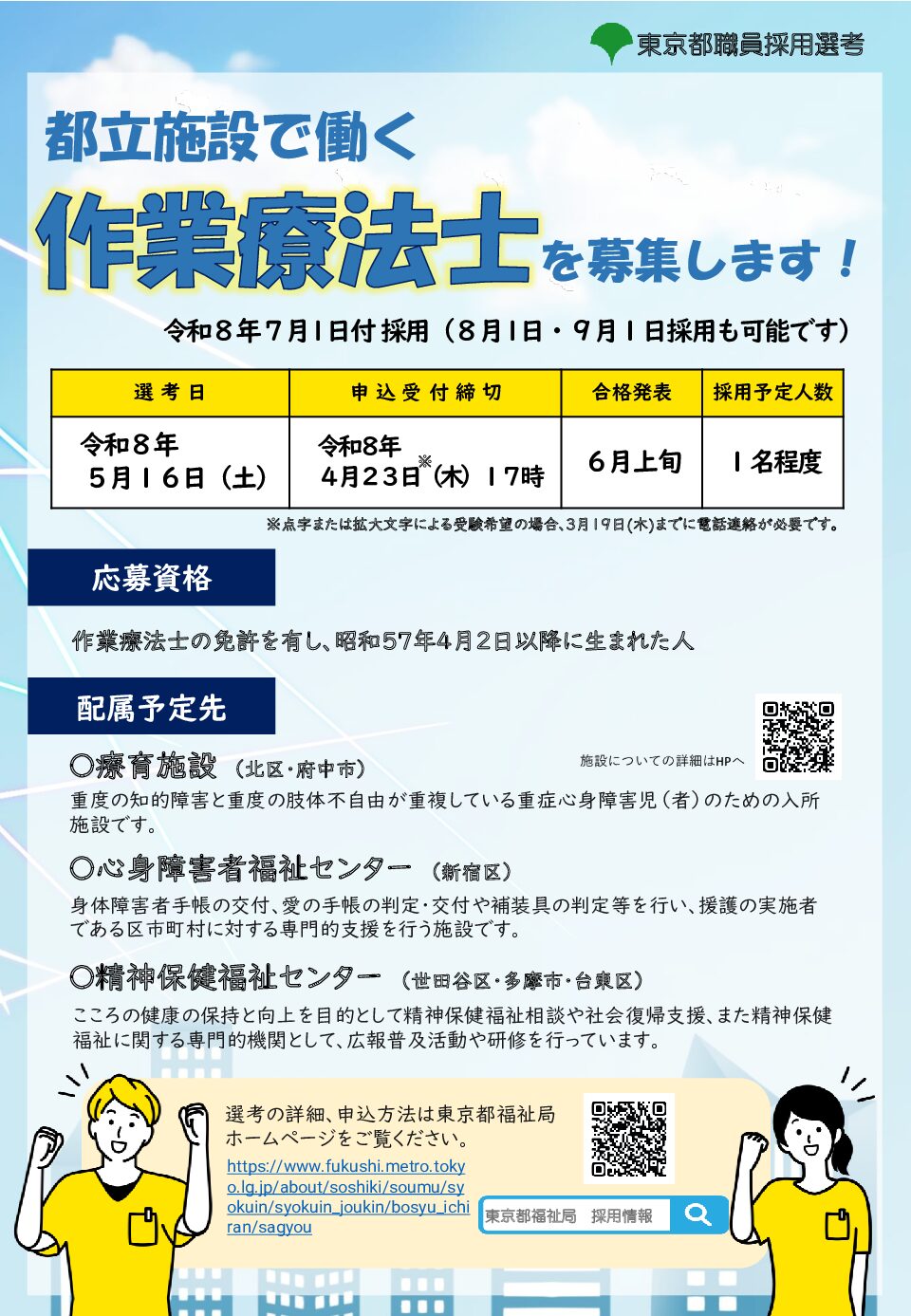 | 問い合わせ先 | 東京都福祉局総務部職員課人事担当 03-5388-3946(直通) 募集の詳細、お申し込みは東京都福祉局ホームページをご確認ください。 https://www.fukushi.metro.tokyo.lg.jp/about/soshiki/soumu/syokuin/syokuin_joukin/bosyu_ichiran/sagyou |
