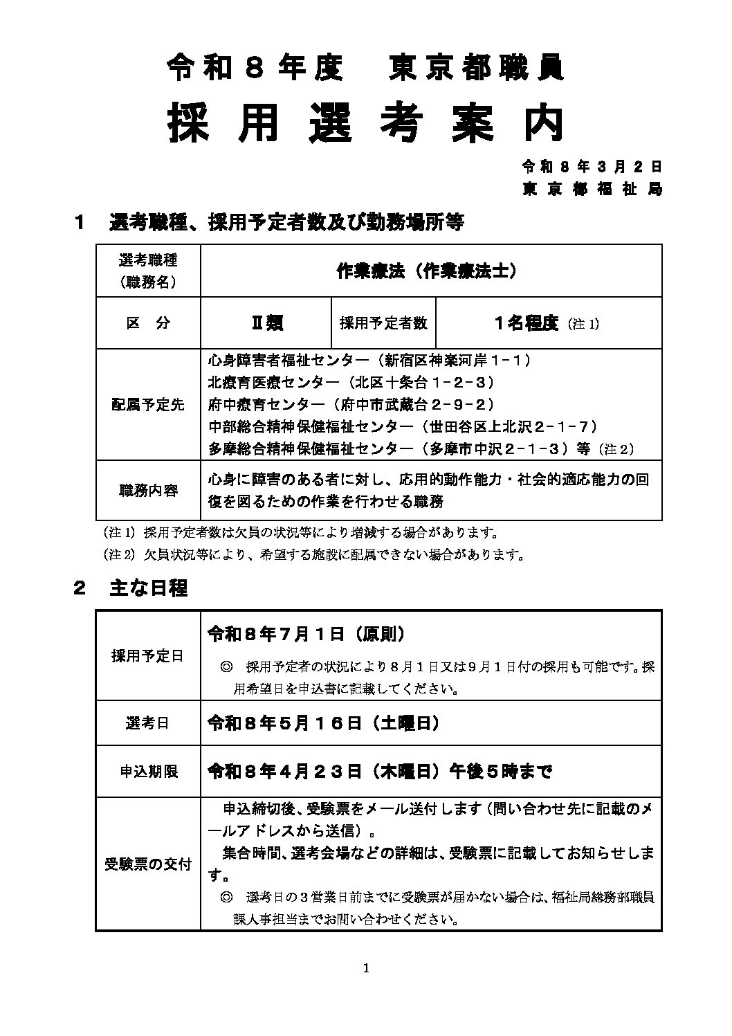 | 募集形態・募集人員 | ・募集人数:常勤職員1名程度 ・受験資格:作業療法士の資格を有し、昭和57年4月2日以降生まれの方 ・採用予定日:令和8年7月1日(8月1日又は9月1日付も選択可能) ・所属及び業務内容:都内療育センターにおける作業療法、心身障害者福祉センター・精神保健福祉センターにおける補装具判定業務など ・勤務時間:9時~17時45分、土日祝休み ・給与・賞与:初任給 約269,800円、賞与年2回(令和7年度実績4.90月) ・休暇:年次有給休暇20日、夏季休暇5日、育児・介護を支援する休暇など |
