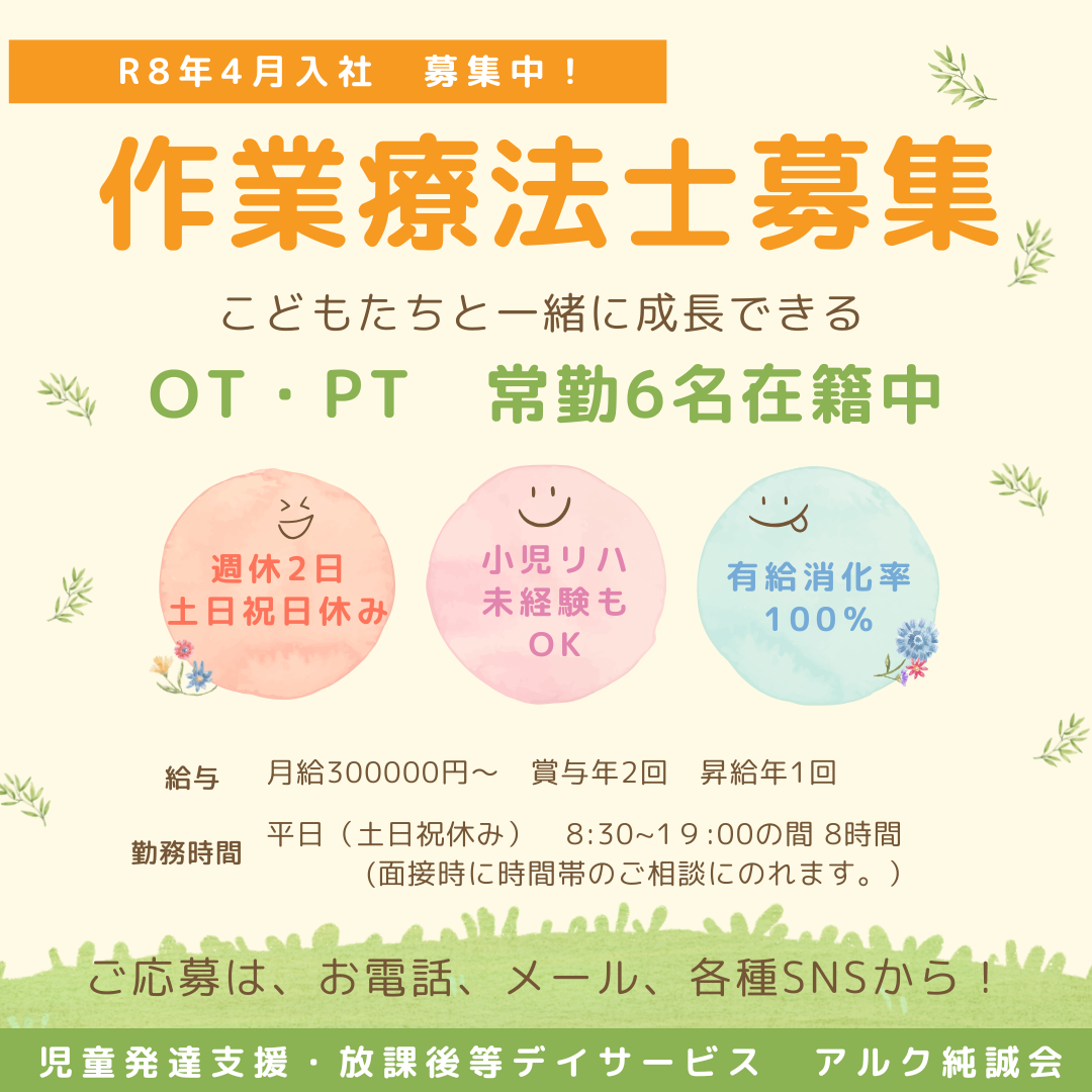 | 募集形態・募集人員 | 正社員 2名 【必要資格】作業療法士資格 【業務内容】 ・発達障がい児、肢体不自由児(身体障害)、医療的ケア児の個別療育(作業療法)の実施 ・保護者とのやりとり ・個別支援計画書の作成 ・集団活動の補助的支援 ・送迎(運転できなくても大丈夫です) など 【給与】月給 300,000円 〜300000円 『内訳』 基本給 194,000円 固定残業代 36,000円(20時間相当) 諸手当 70,000円 ※固定残業代は残業の有無に関わらず支給。上記の想定時間を超過した場合は、別途超過分を支給します。 【賞与】 あり(年2回) 【昇給】 あり:年1回 【加入保険】 社会保険完備(厚生年金保険、健康保険、労災保険、雇用保険) 【就業時間】 8:30~17:30、9:30~18:30、10:00~19:00の中から応相談 【休日】 土日祝日完全休業(年間休日123日) 産休育休制度あり 介護休暇 年末年始休暇(12月31日~1月3日) 有給休暇年10日以上(法定通り) ★有給消化率100%です! 埼玉県三郷市早稲田にある児童発達支援・放課後等デイサービス アルク純誠会です。 【こんな方におすすめ】 ・小児リハビリに関わりたい ・仕事とプライベートの両方を充実させたい ・多職種でチームを組んで楽しく働きたい ・福祉分野で活躍したい 【おすすめポイント】 ・資格取得支援制度あり ・ブランクありOK ・昇給・賞与あり ・持ち帰り仕事なし、残業すくなめ ・JR武蔵野線「三郷駅」より徒歩5分の好立地 ・バイク・車通勤OK(駐車場完備) 20代、30代、40代、50代、60代まで幅広い年齢層のスタッフが働いています。 若い世代もシニア世代も活躍できる職場です。 |